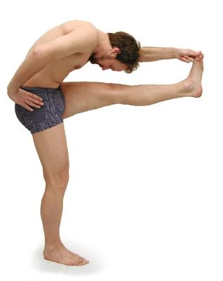 This is a complex exercise, a combination of a balance exercise and a variant of Janushirshasana. This variant allows the extension and the stretching of the posterior musculature of the legs.